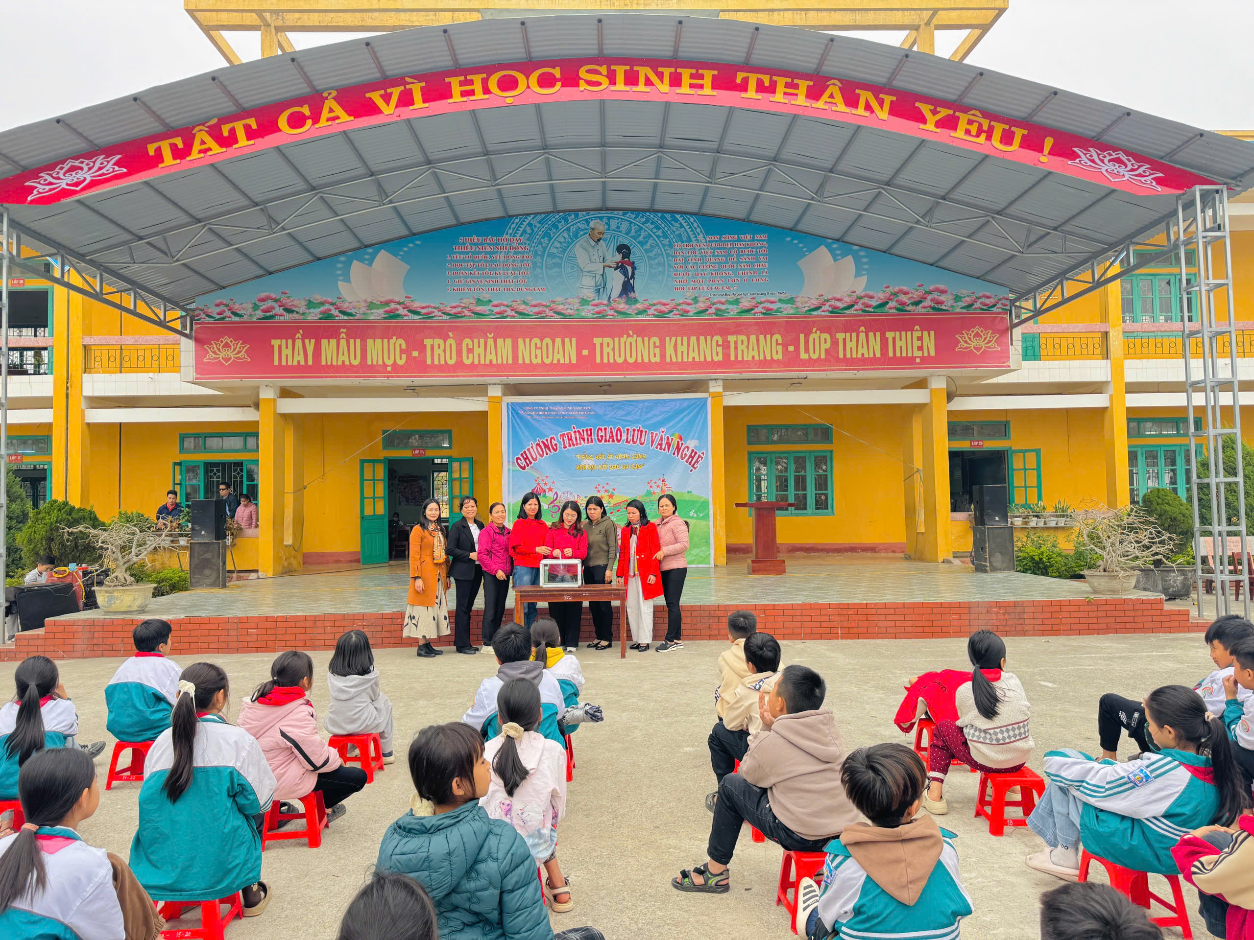 Các em đã mang đến những lời ca, tiếng hát rất trong sáng, những tiết mục hay và cảm động. Nhân buổi giao lưu này, ngoài các tiết mục văn nghệ, nhà trường đã có những lời thăm hỏi, khích lệ, động viên ân cần đến các em khuyết tật và kêu gọi các cán bộ, giáo viên, nhân viên và các em học sinh hãy cùng chung tay sẻ chia, giúp đỡ bằng hình thức quyên góp ủng hộ.